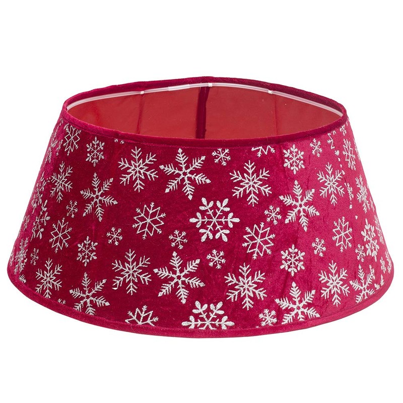 - Christmas tree collar is made from classic red velvet material, decorated with glittery silver snowflakes, and trimmed with solid red velvet edging. Very easy to assemble – just insert two plastic tubes into the top and bottom of the tree stand collar