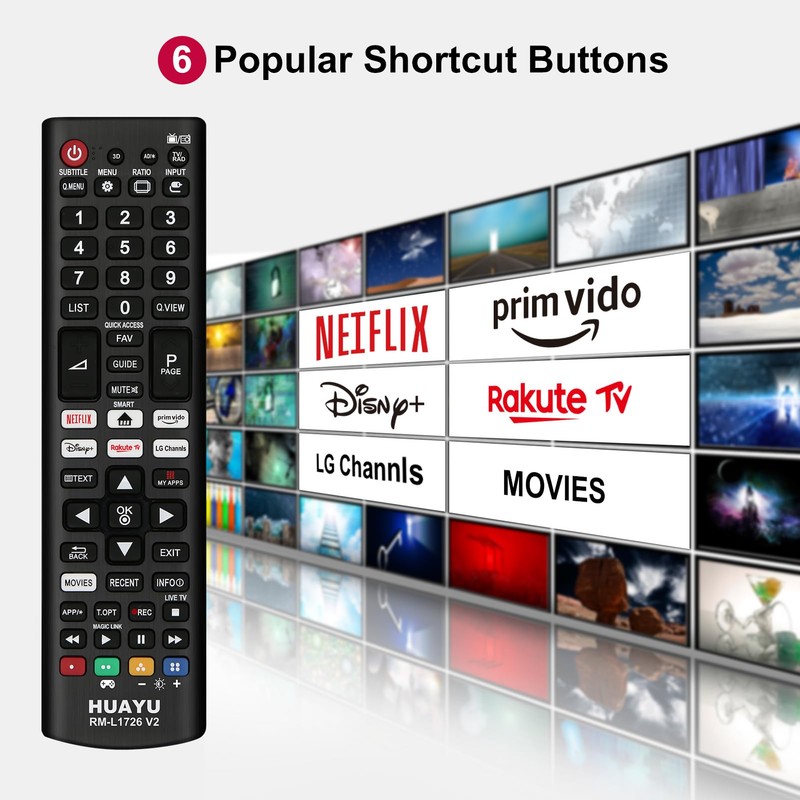 - 6 Shortcut Buttons: Our remote control is equipped with 6 shortcut buttons, including NEIFLIX, Prim Vido, Rakute TV, Disny, LG Channls, and MOVES. Enjoy instant access to your favorite streaming platforms—no more navigating complex menus. Simply press and enjoy your shows and movies with ease.