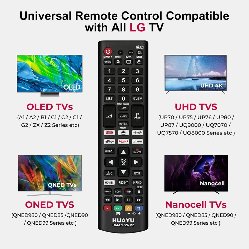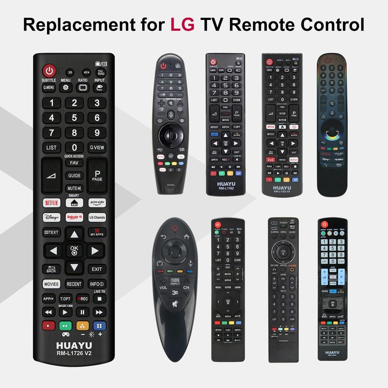 - No setup Required: Our infrared remote no programming or setup required, just insert 2*AAA batteries and it will work well with your LG TV. (Note: Batteries and manual are not included).The HUAYU remote is the perfect replacement for your old or damaged with LG TV remote.