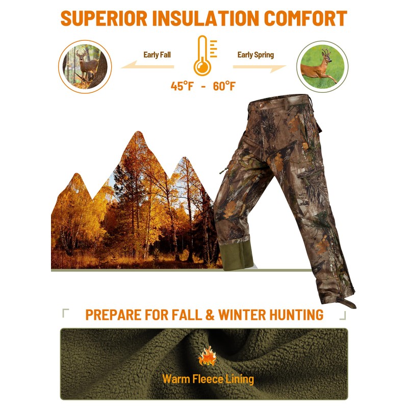 - Keep Warm: Fleece lined hunting pants made from durable polyester, featuring water-resistant, windproof softshell and soft fleece lining for protection against the elements; stay comfortable during early and late season hunting with our camouflage pants