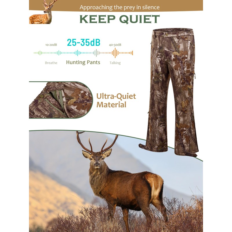 - Upgraded Quiet Material: Camouflage hunting pants feature ultra-silent fabric and noiseless zippers, ensuring minimal noise during movement; this feature allows stealthy navigation through the woods without alerting deer, duck, turkey, coyote, elk