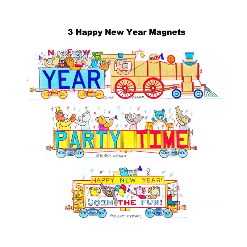 New Year Locomotive, Gondola & Caboose set of 3 magnets Andy Fletcher