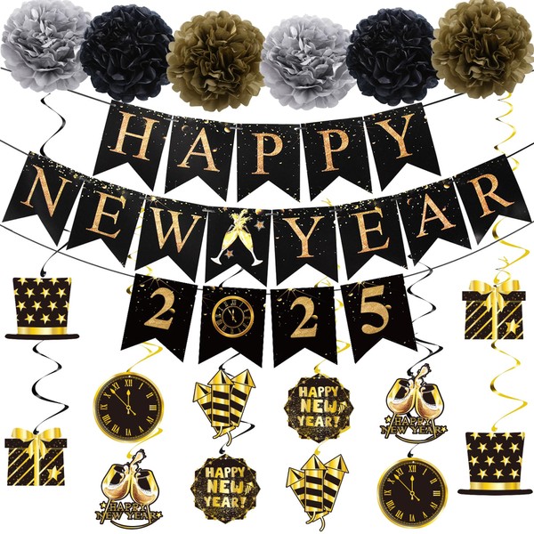 New Years Eve Party Supplies 2025-33Pcs Happy New Year Decorations Kit, Including Happy New Year Banner, Hanging Swirls, Paper Pom Poms - Accessories for Party Decor