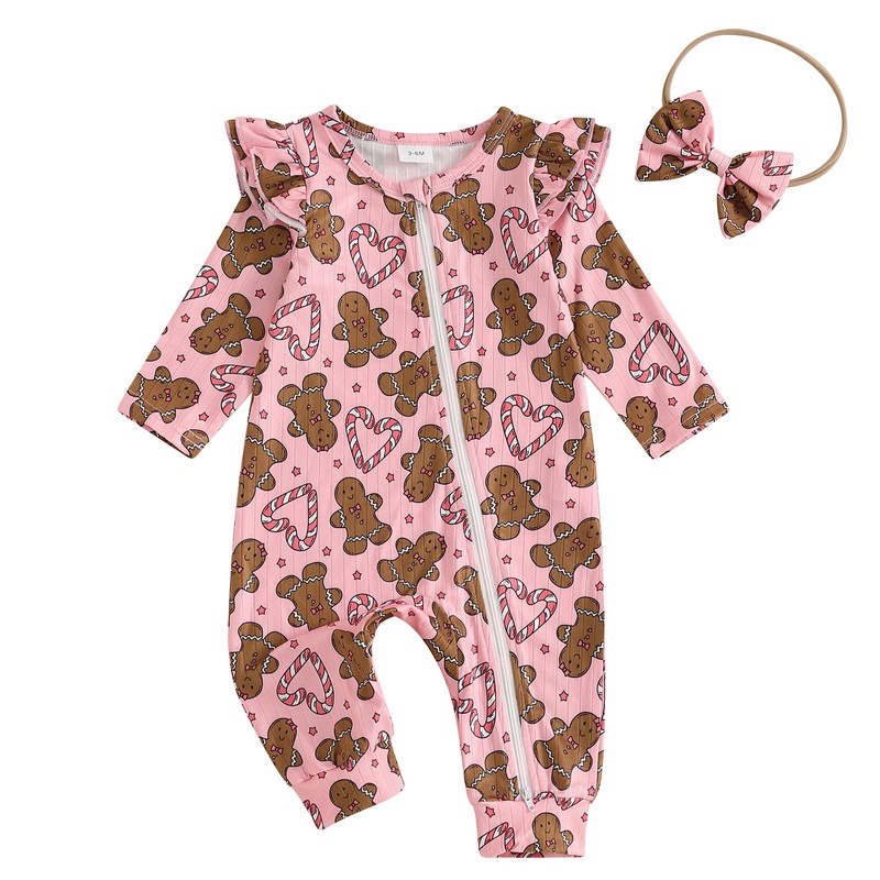 - Features: Baby long sleeve romper, flying sleeves, round neck, cartoon Christmas elements print, full length, front button down design, easy to wear and take off and changing diapers, super cute baby girl gingerbread man bodysuit jumpsuit with zipped design, baby girl Christmas jumpsuit withheadband Baby girl Christmas outfits fit for newborn infant toddler baby girls
