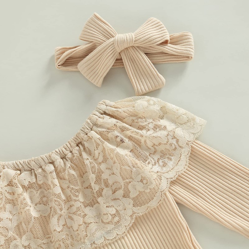 Newborn Baby Girl Clothes Infant Rib Frill Long Sleeve Romper Floral Flared Pants Headband 3pcs Fall Winter Outfits (Denim-Beige 2, 6-9 Months)