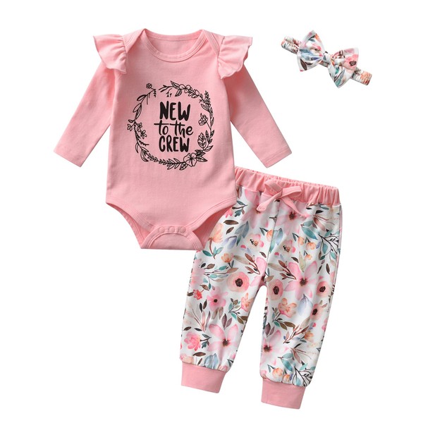 Newborn Baby Girl Clothes Preemie Long Sleeves Romper+ Floral Pants Headband 3pcs Set Pink 0-3 Months