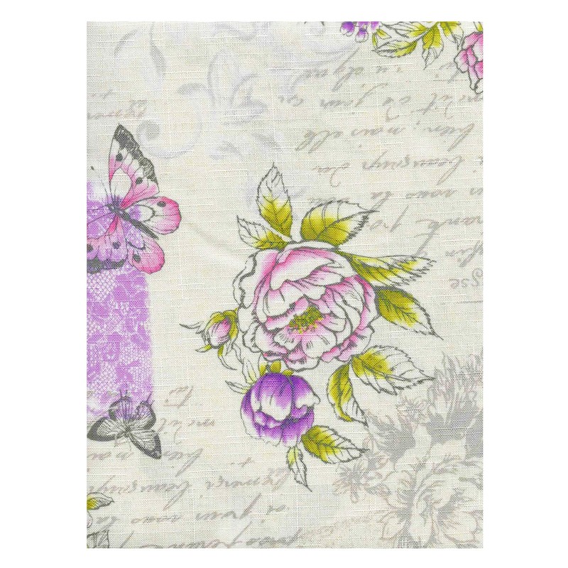 - STYLING: The colorful Newbridge Vintage Blossoms Shabby Chic Fabric Tablecloth features and allover vintage inspired design incorporating spring floral blooms lilac, pink and green colorations with coordinating lavender lace designs with an allover vintage post card and hand written script on an ivory background.