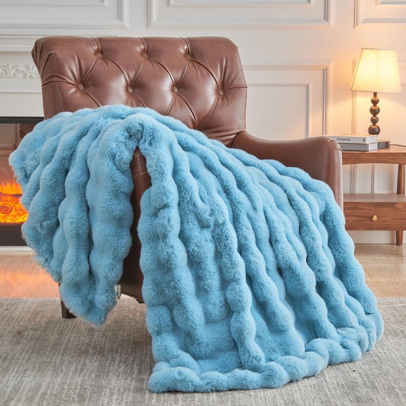 NEWCOSPLAY Faux Fur Throw Blanket Blue Luxury Fluffy Thick Warm Bubble Blanket for Couch Sofa Bed 1000GSM (Blue Bubble, Throw(50"x60"))