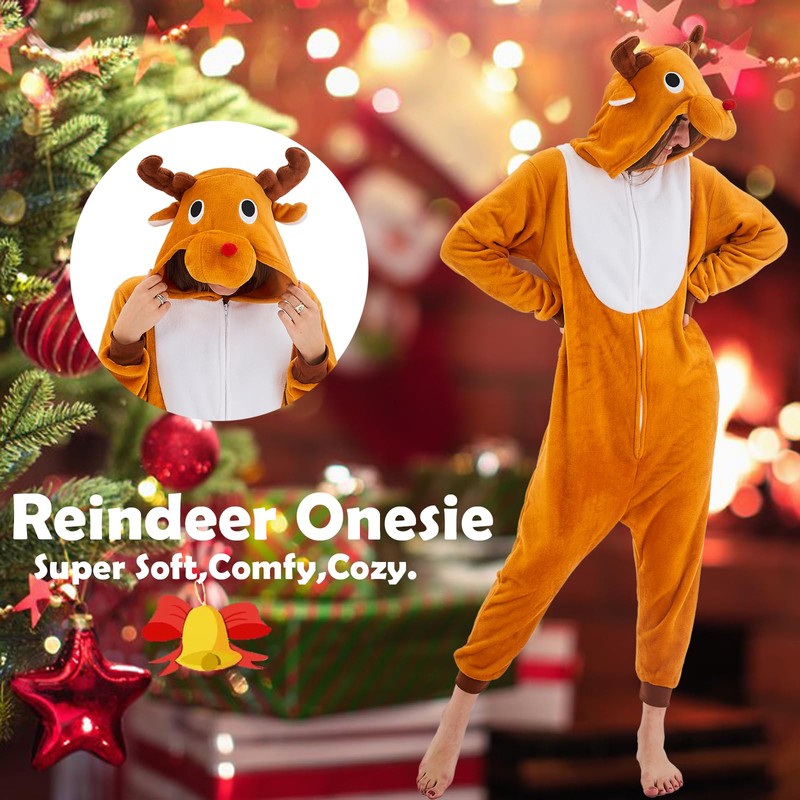 NEWCOSPLAY Unisex Adult Brown Reindeer Onesie Plush One Piece Pajamas Christmas Costume(Brown Reindeer,Large)
