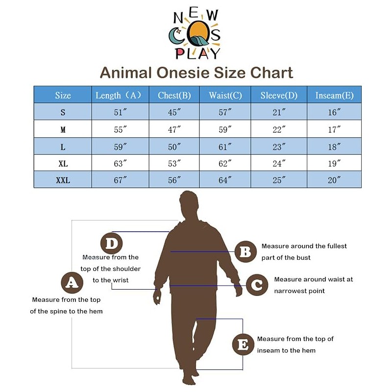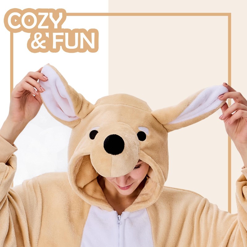 - Design: Unleash your inner child with our fun and cozy animal onesie costume! The loose fit design with zipper closure allows for great relaxation and comfort. The two pockets are perfect for holding small items or keeping your hands warm.