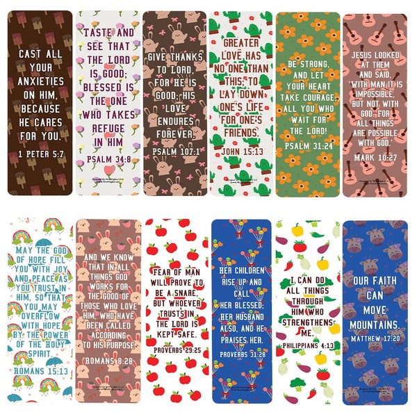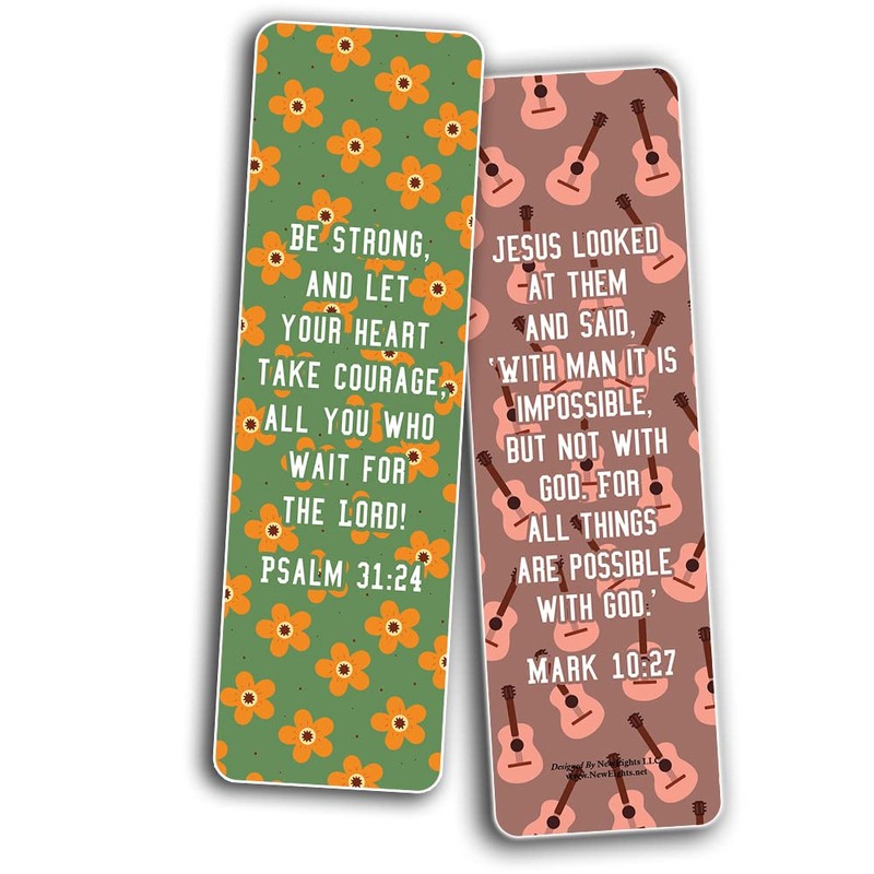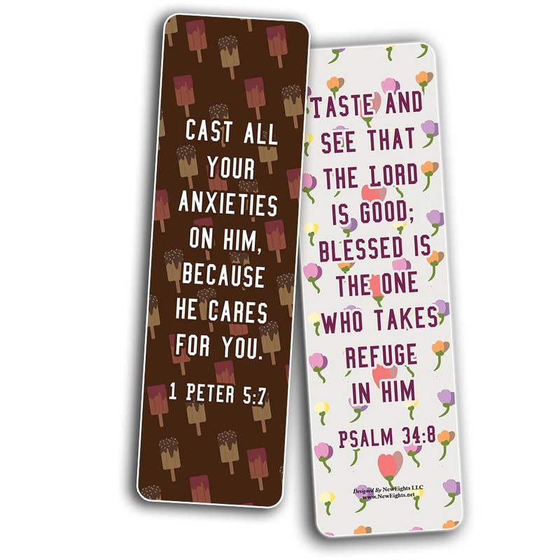 - BOOKMARKS WITH UNIQUE DESIGNS & PRINTED ON BOTH SIDES. Front and back of the bookmark displays the quoted biblical texts that are designed to encourage the user. Great stuffers for kids.
