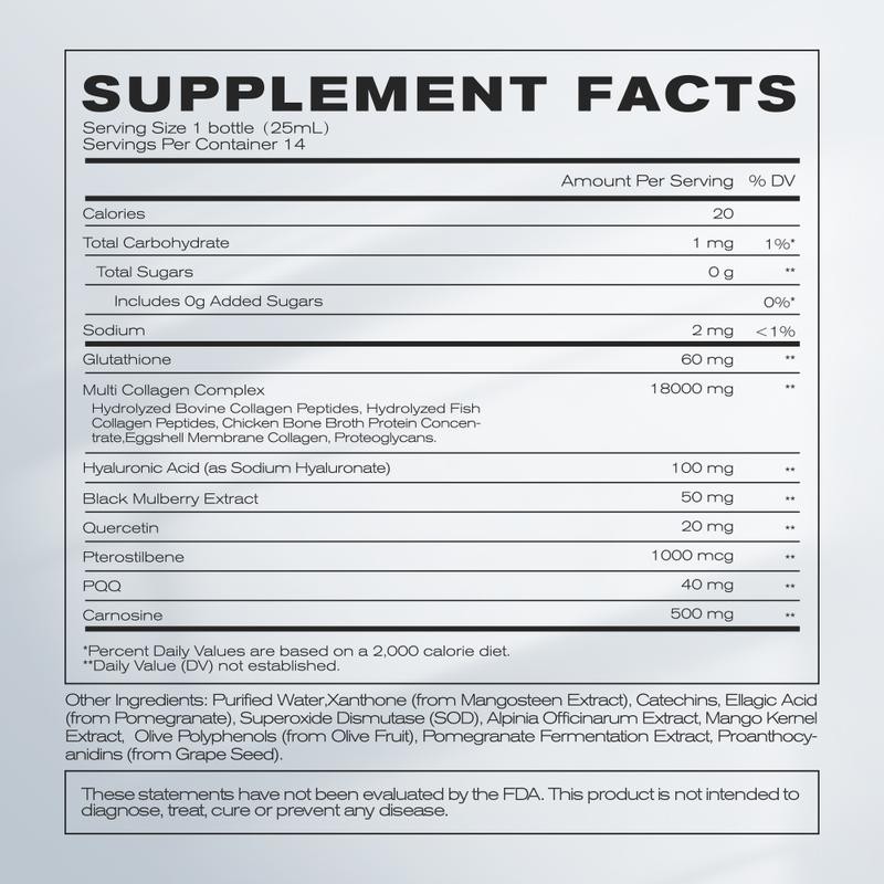 - Ingredients: Glutathione Multi Collagen Complex (Hydrolyzed Bovine Collagen Peptides,Hydrolyzed Fish Collagen Peptides,Chicken Bone Broth Protein Concentrate,Eggshell Membrane Collagen,Proteoglycans) Hyaluronic Acid (as Sodium Hyaluronate) Black Mulberry Extract Quercetin Pterostilbene PQQ Carnosine