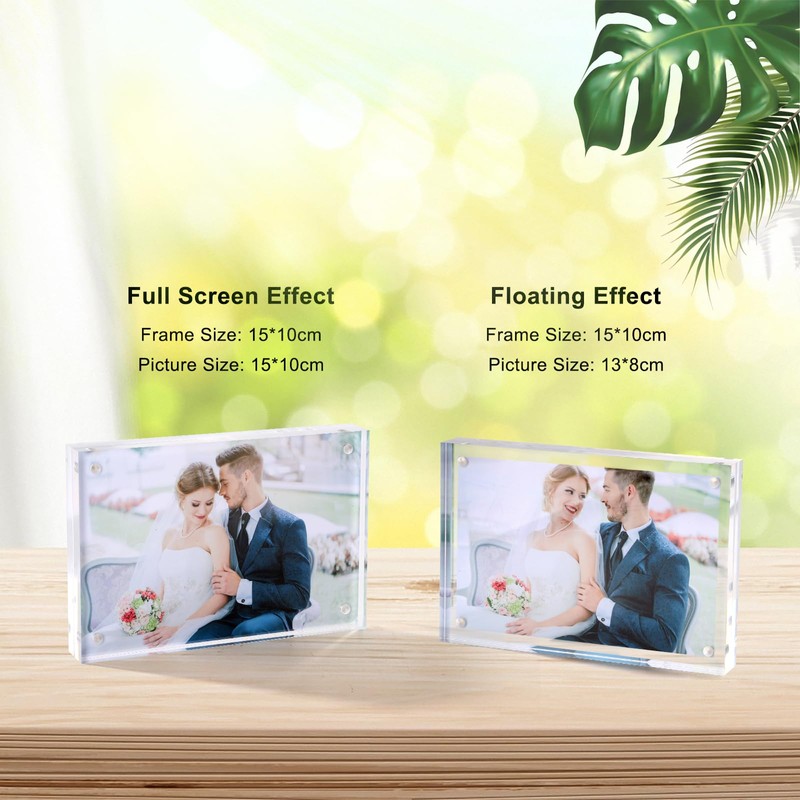 - WELL MADE & STURDY The magnetic acrylic frame is made of high quality clear acrylic material, simple design with super smooth edges, is shatterproof, making it more stable and safer than other weakly fragile glass. Two 10mm acrylic photo blocks and four pairs of solid embedded corner magnets hold the two photos together.