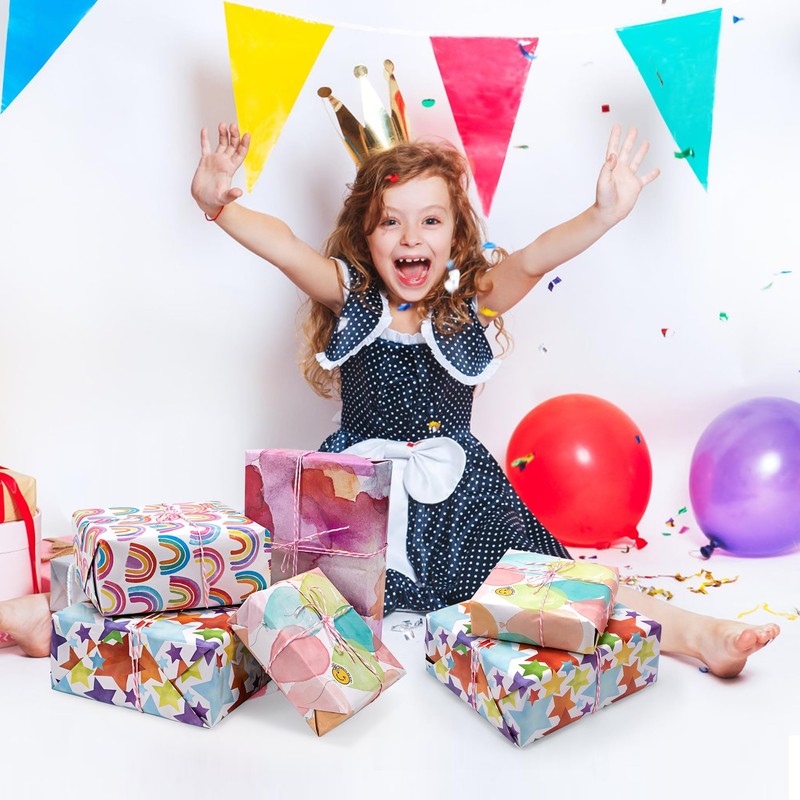 - RAINBOW DESIGNS The wrapping paper set includes patterns of rainbow, polka dot print, balloon, five-pointed star, watercolor and striped lines. The rich colours and beautiful pattern design make the gift more exquisite.