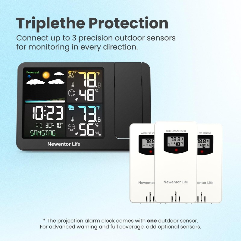 - Multiple Sensor Connectivity: The clock comes with the ability to connect up to three sensors, with one sensor included in the package. This feature allows you to monitor temperature and humidity levels in different locations simultaneously, providing valuable insights and ensuring comfort in various areas of the home.