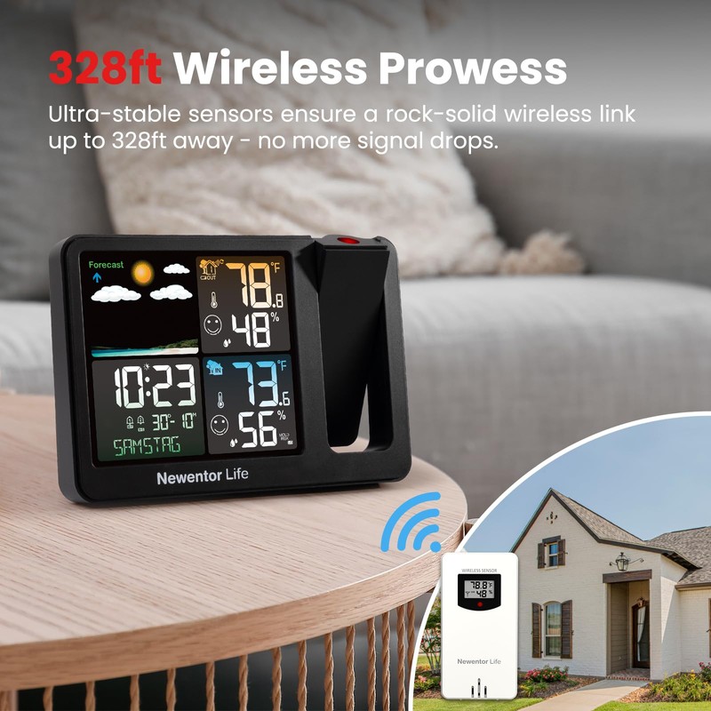 Newentor Life Projection Alarm Clock, Projection Clock for Bedroom Ceiling, Projector Clock with Weather Station, Indoor Outdoor Temperature Humidity Monitor, Forecast, Adjustable Backlight, Black