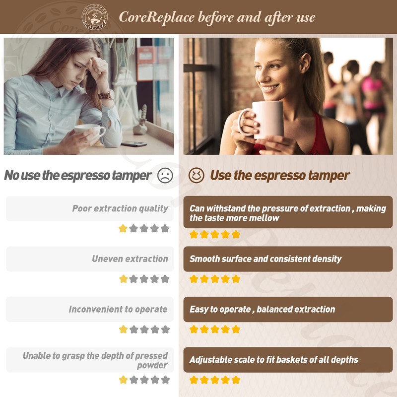 - New Upgrade Design: This espresso press tamper has been upgraded with a constant block, which can completely solve the problem of pressure deviation in the process of pressing coffee powder. Provides a smooth surface and consistent density, which improves the extraction quality of the coffee and makes the coffee stronger.