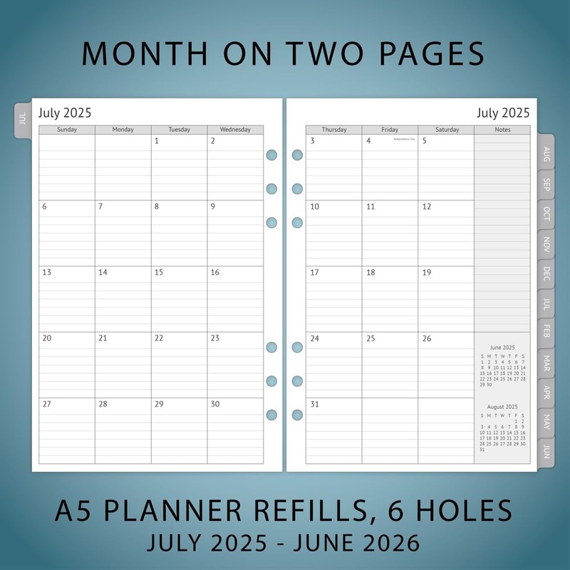 newestor 2025-2026 A5 Planner Inserts, Filofax A5 Compatible, Jul 2025 - Jun 2026, Weekly and Monthly Appointment Book Pages, Tabbed, 6 Holes