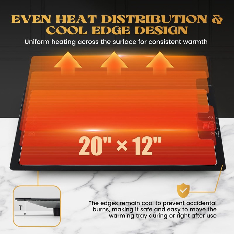 - Timer/Schedule Function -- Featuring a 12 or 24-hour timer, you can schedule the warming tray to turn on or off automatically. Ideal for preheating before meals or saving energy after use, making it both convenient and efficient.