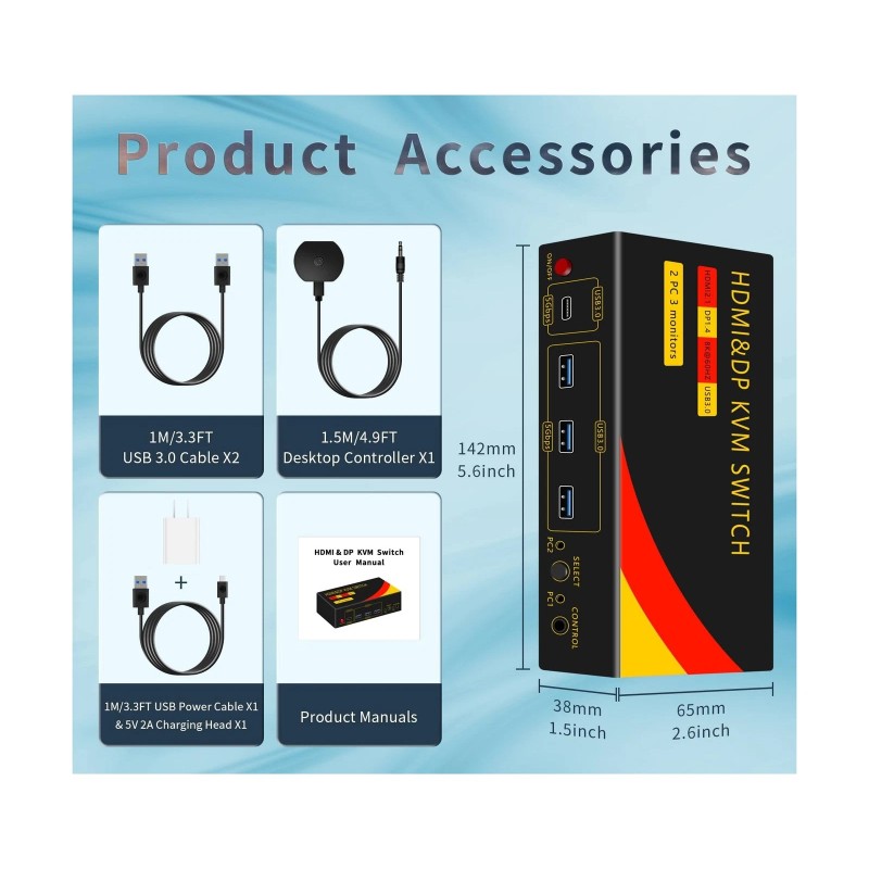 - HDMI Displayport KVM Switch with 4 USB 3.0 Ports3-Display KVM Switch with 4 USB 3.0 ports, including 3*USB-A and 1*USB-C, you can connect more USB devices. Support superfast 5Gbps data transfer, you can connect keyboard, mouse, printer, USB camera and other USB devices. Note: Each computer needs to connect a USB cable to the KVM switch.