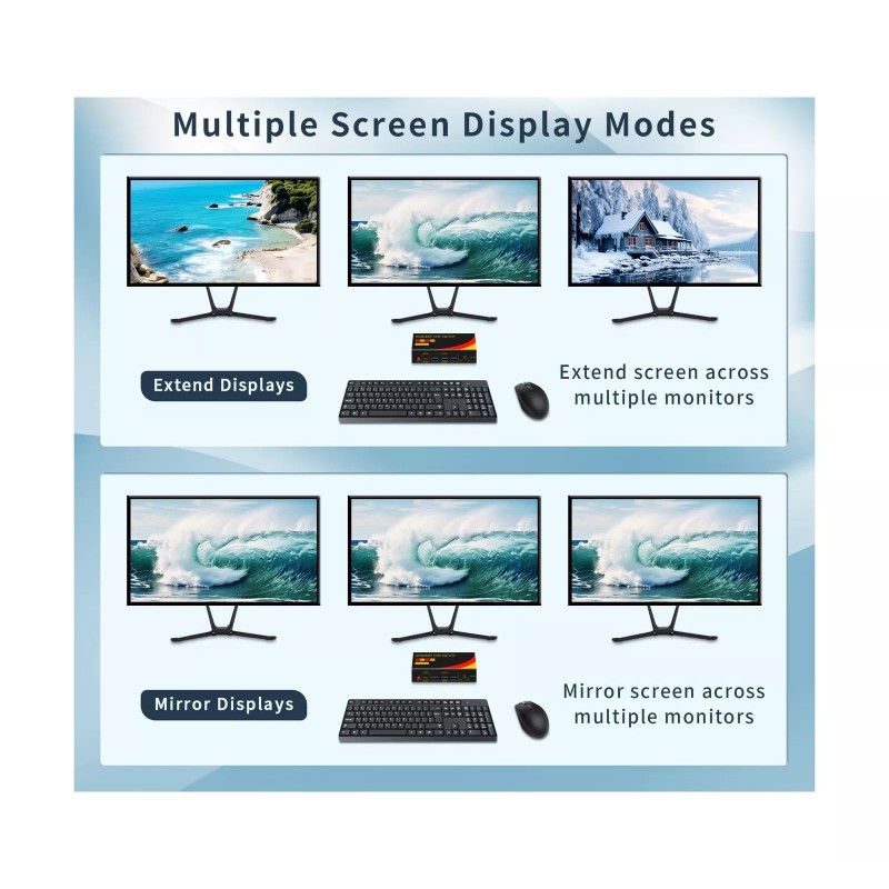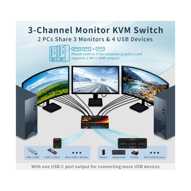 - Ultra HD 8K Resolution 3 Monitor KVM Switch.Displayport : Supports up to 8K@60Hz /4K@120Hz resolution, HDMI : Supports up to 8K@60Hz/4K@120Hz resolution. And backward compatible with lower resolution. Note: The final resolution is related to the graphics card, monitor, cables and adapters, etc.