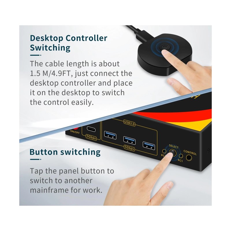 - Reliable compatibility and 2 switching modesThe KVM Switch 3 monitor is plug-and-play without drivers. Suitable for computers and signal sources with Windows, Mac, Linux and other operating systems. Suitable for business office, gaming and other scenarios. There are two switching methods: key switching and wired extension controller switching. It is recommended to use wired extension controller for switching, the KVM switch and cable can be placed 4.9 feet away from the desktop, the desktop is clean and tidy.