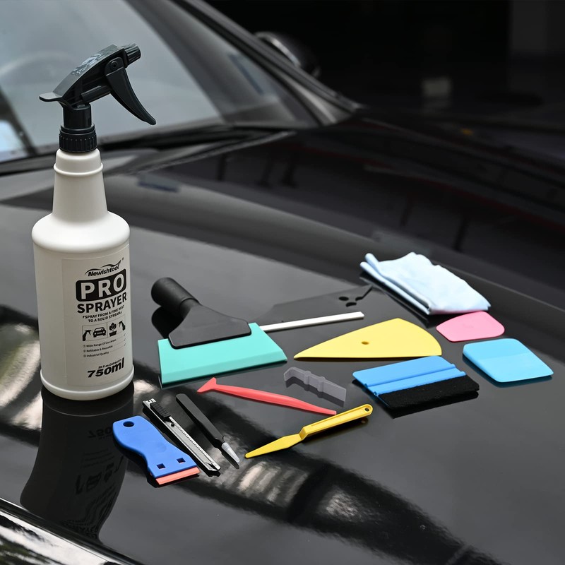 - 14 IN1 WINDOW TINT TOOLS: NEWISHTOOL tint kit included 14 pcs window tint tools: 750ml sprayer bottle, rubber squeegee, blue squeegee with fabric felt, blue soft PPF squeegee, hard pink scraper, yellow contour squeegee, small squeegee, micro squeegee, shank squeegee, conqueror squeegee with rubber lip, razor scraper with spare plastic blades, film cutting knife & blades, microfiber wiper, precision tweezer.