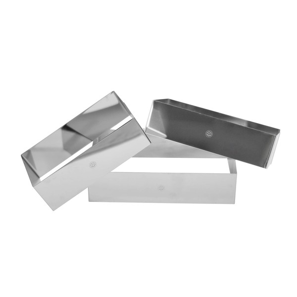 - Set of 3 sizes of 6 cm (2.4 inches) height rectangular cake rings: one 12 cm (4.75 inches) x 20 cm (8 inch); one 14.5 cm (5 inches) x 22.5 cm (9 inch); a 16 cm (6.5 inch) x 25 cm (10 inch) x 6 cm (2.5 inch) height.