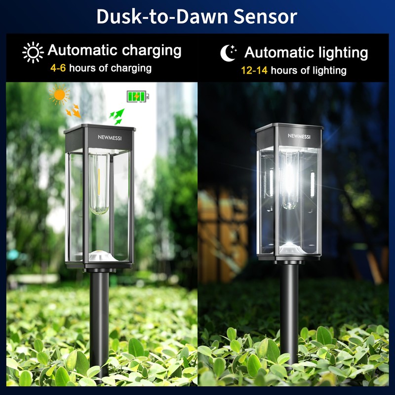 - 🌞【Elegantly Minimalist Design】: NEWMESSI solar light for outside garden combines timeless and modern aesthetics, featuring a unique, minimalist design that effortlessly marries classic and contemporary styles. With a high-quality clear shade and a classic vintage filament, this light not only elevates its visual appeal but also minimizes brightness decay over time. These solar pathway lights are the perfect choice for enhancing the beauty of your garden landscape.