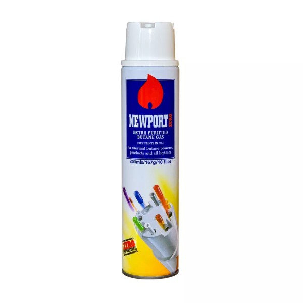 The number ONE Butane in Europe is now available here in the U.S. Newport butane is Extra Purified Near Zero Impurities Gas Perfect to use with Turbo flame Lighters, Refilling Butane Lighters, other Butane-Powered Products And other personal needs! (300 ml/ 10 fl oz) comes as a single can. A great deal. Includes EIGHT couplings/flints to help with odd ball lighters. Extra purified to keep your lighter clean from clogging. Size: 9” tall by 2" round