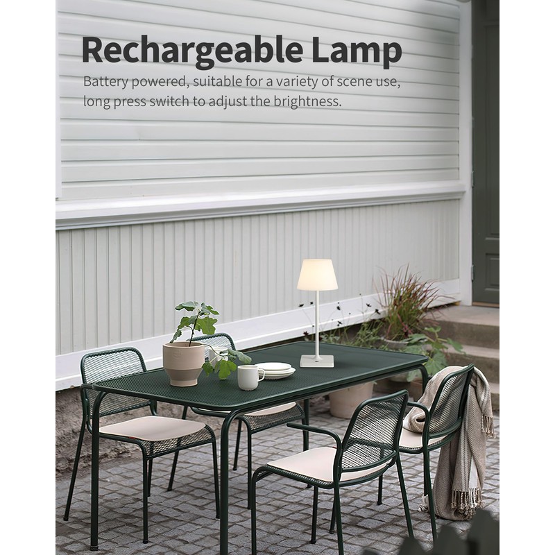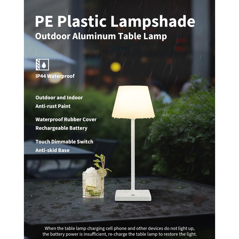 - IP44 Certification: IP44 certified PE plastic lamp, closed structure, rain and sun protection. Matte powder coated aluminum alloy body with delicate texture. Sturdy rubber protects the charging port from water sprays, so this waterproof light can be used as a shower light. Weighs 1.52 pounds and features a cordless design for easy mobility. The base includes a soft cushion to prevent tilting with the wind, making it an ideal table lamp for patios, restaurants, camping and more.