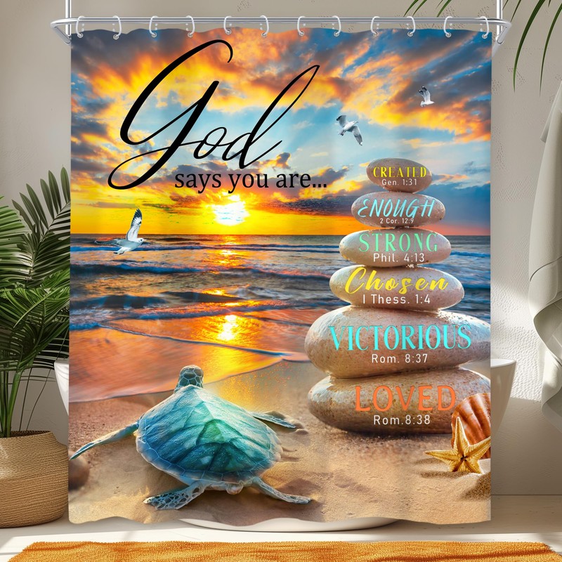 Newsely Beach Sea Turtle Shower Curtain 60Wx72H Inch Bible Verse Hawaii Ocean Sunset Scenery Coastal Stone Shower Curtain Bathroom Set Christian Quote Waterproof Bath Decoration Accessories Home Decor