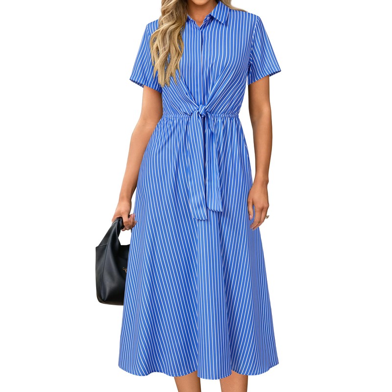 - Summer Midi Dress Design: Simple polo collar, short sleeve, elastic tie waist, practical pockets, striped design flatters a grace silhouette. Nicely Drape Long flowy hem allows easy movement, professional yet stylish, shirt work dress exudes your charm