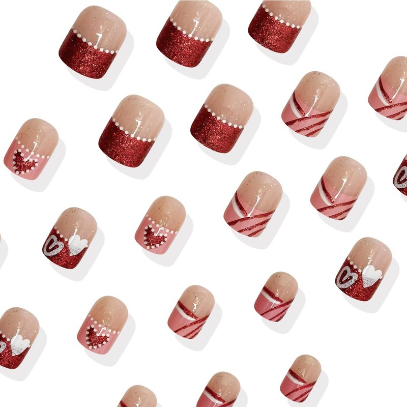 - Valentines Pink Nails Kit: Our short square press on nails kit, It contains 24Pcs heart false nail, 24 pieces of jelly glue, 1 mini nail file, 1 wooden stick.There are 12 different sizes of fake nails to ensure proper fit to your nail bed to give you the most natural look! Suitable for women of every age