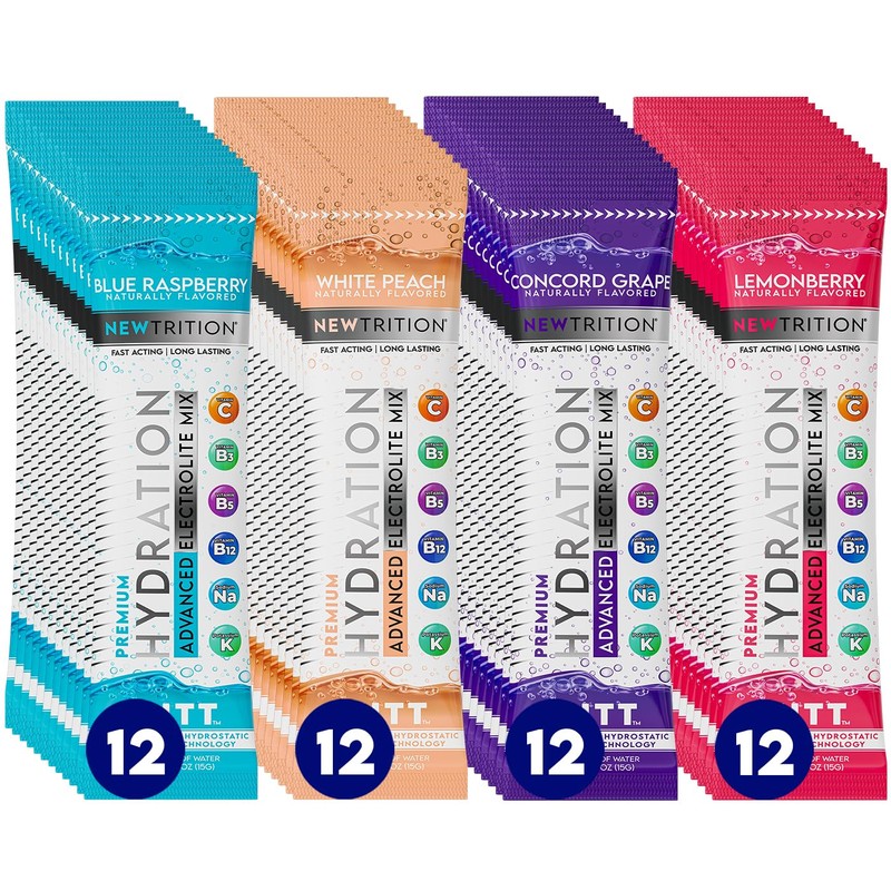 NewTrition Hydration Powder, Electrolyte Powder Packets, Naturally Flavored Hydrating Packets for Water, Fast Acting Electrolytes with Vitamins, Blue Razz, Peach, Grape, Limonberry, 48 Servings
