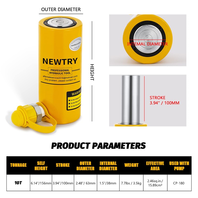 - ▷[BASIC PARAMETERS]---Tonnage: 10T | Stroke: 4’’/100mm | Self height: 6.14’’/156mm | Outer diameter: 2.48’’/63mm | Internal diameter:1.5’’/38mm | Weight:7.7lbs/3.5kg | Effective area: 2.46sq.in./15.89cm² | Usded with Pump: CP-180(B06XG4HBNT) | Connector: ZG3/8’’ male connector |