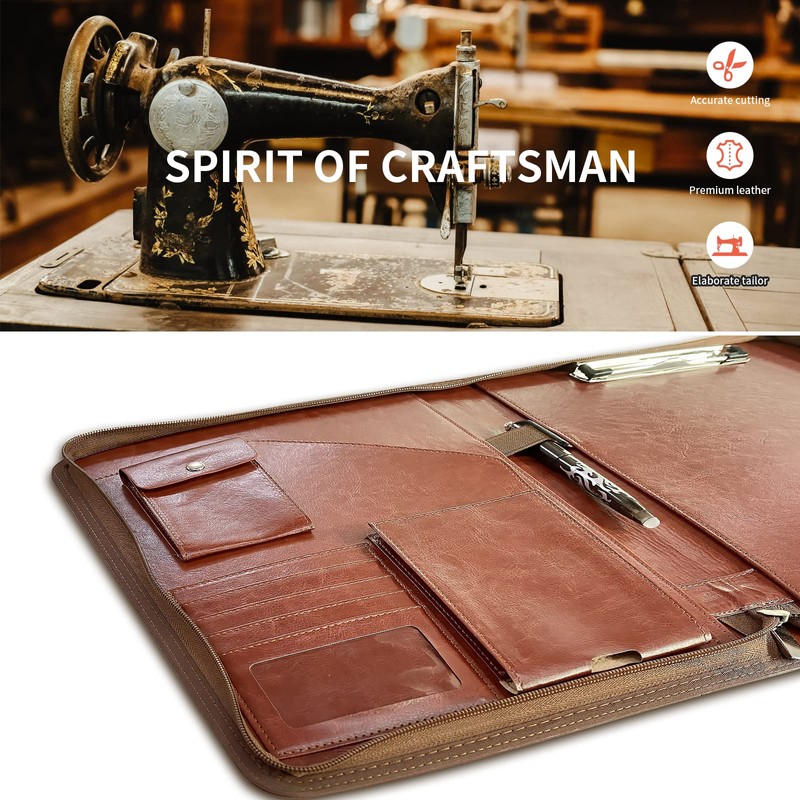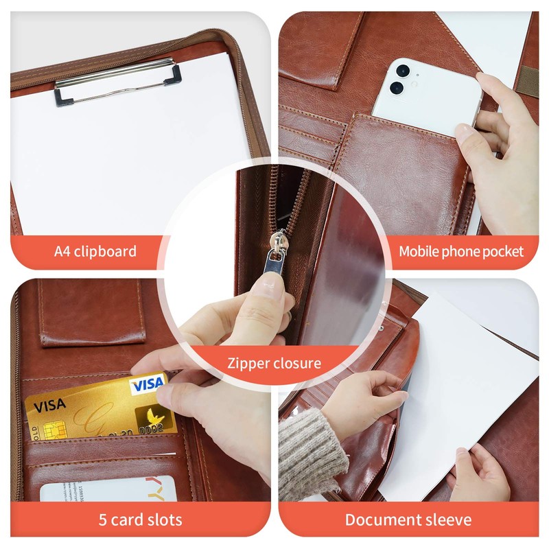 - 【Large Capacity】This portfolio organizer is well equipped with a A4 clipboard, 5 card slots with a ID window, a mobile phone pocket, a gadget pocket with fastener, a pen holder and a tablet sleeve. Perfectly functional for everyday use.