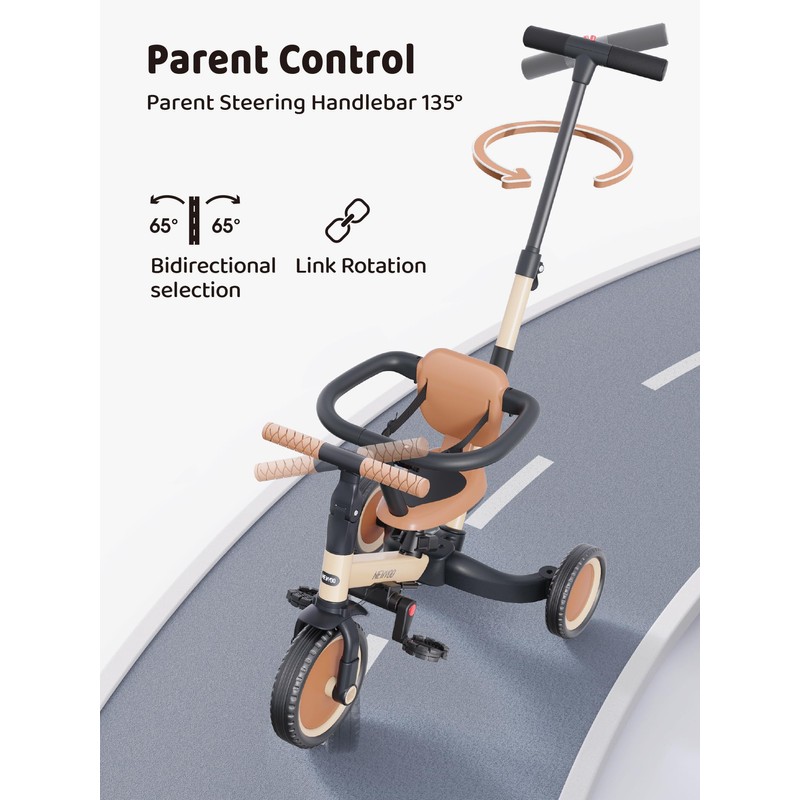 - Steering Push Handlebar: Rotating 135 degrees to control and steer the speed and direction of tricycle. Protecting your child from falling down and injuring. It also can be adjusted according parents' height so that dad and mom can accompanied to practice with your little.