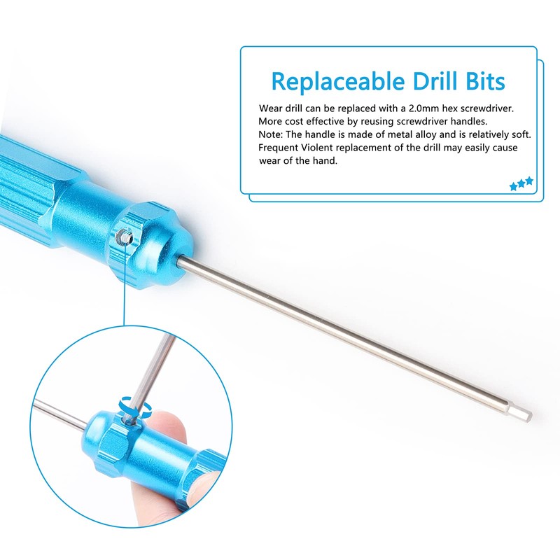 • Hex screwdriver tips' Dia is 1.5mm, 2.0mm, 2.5mm, 3.0mm. Light weight, small volume and easy to carry.