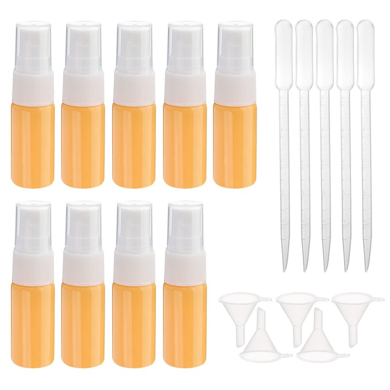 Newzoll 9pcs 10ml Glass Spray Bottle for Essential Oils Small Empty Refillable Travel Fine Mist Sprayer Bottle, for Cleaning, Aromatherapy Dispenser (Orange, funnel and dropper included)