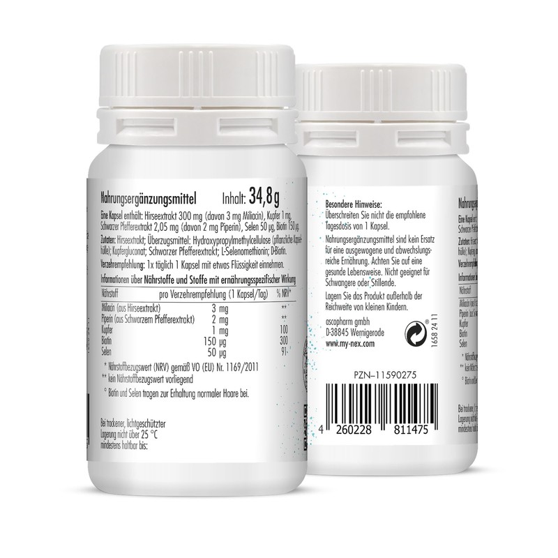 Each capsule contains 300 mg of millet extract with 3 mg miliacin - a natural plant lipid. The combination with 2 mg piperine supports the absorption of vital substances. The vegan formula is free from dyes, preservatives or fillers.