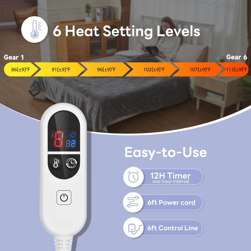- [π½ππππππππ πΌππ Β· π·πππππππππππ πΎπππππ] Whether on the sofa as a heated throw or on the bed as an electric blanket, you can always set your ideal temperature! Features 6 adjustable heat levels, a clear LED display, and 1β12 hour timer. Four sizes with a 12 ft extended cord fit bedroom, couch, or office.