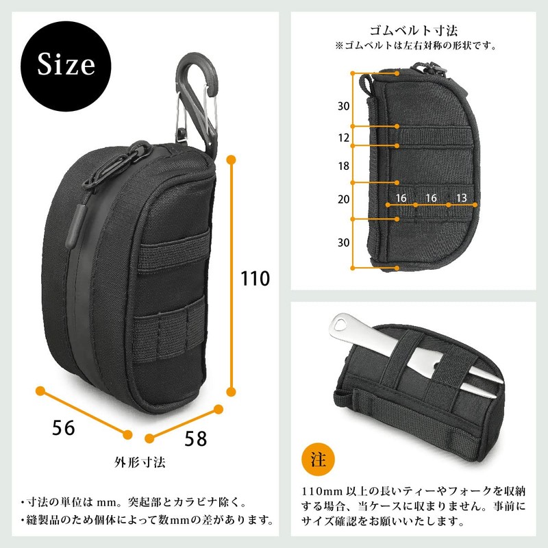 - Features: Comes with an elastic belt that can store your tees. Fits large and small tees. Some special tees and green forks may not be able to be stored in this case. Please check the size of this case before placing a long tea or fork. Golf balls, tees, and green forks are not included with this product. Comes with belt loops that can be used to pass through the waist belt. Fits belts up to 45mm wide. Uses water-repellent fabric and water-repellent zippers