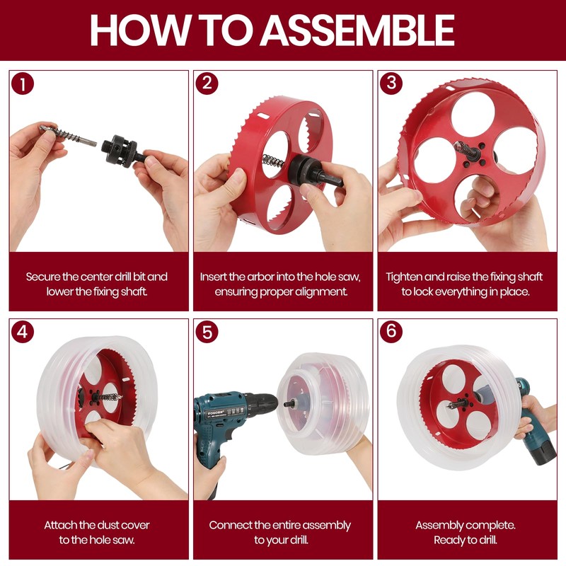 - [Easy to Assemble and Use] Assembling the hole saw is straightforward: insert the arbor into the center of the dust bowl, attach the saw, and secure it to your drill. The user-friendly design allows both professionals and DIY enthusiasts to achieve precise, clean cuts with minimal effort.