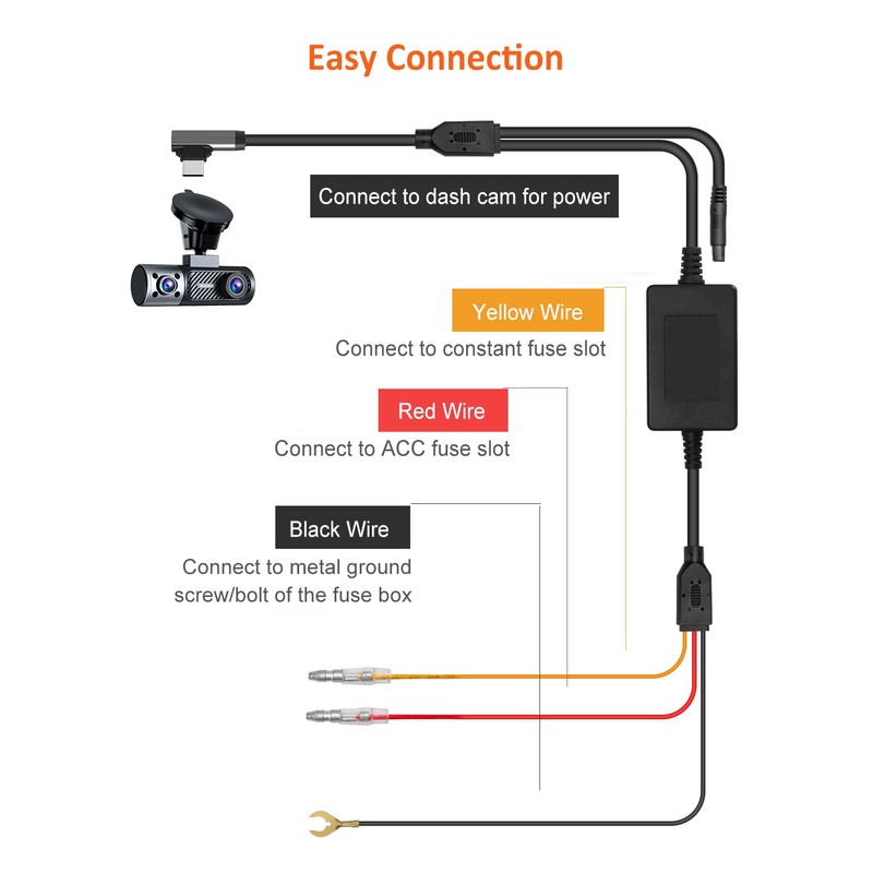 - 【Wide Compatibility】Compatible with most the dash cam with a USB-C Port and comes with four types of fuse taps and fuse blades for you to select the fuse tape and blade the vehicle requires.