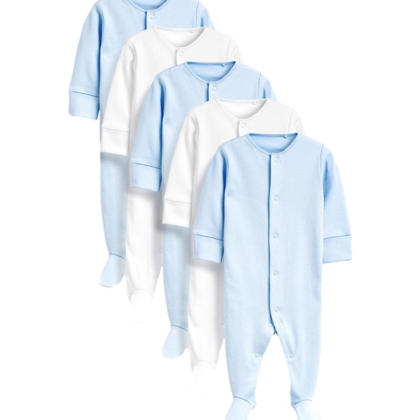 Our pyjamas have built-in scratch protection mittens for babies aged 3 to 6 months and are free from harmful dyes or chemicals. Nickel-free press studs and lined foot for added comfort and warmth. The multi-pack contains five pyjamas in three different colour variations.