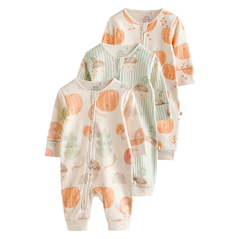 NEXT Footless Pyjamas with Two Way Zip, Pack of 3, cream, 6-9 months