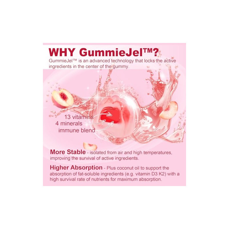 - Liquid Filled GummiesNo time to prepare a healthy and balanced diet? Try this daily womens multivitamin gummy with all 22 essential vitamins and minerals: Vitamin A, C, D3K2, E, B-complex, calcium, iron, inositol, iodine & zinc. GUMMIEJEL gummy-filled technology infuses temperature or pH-sensitive active ingredients into the center of the gummy to make nutrients more easily absorbed, you'll love the explosion of flavors and the ultimate sensory experience of multivitamin for women gummies.
