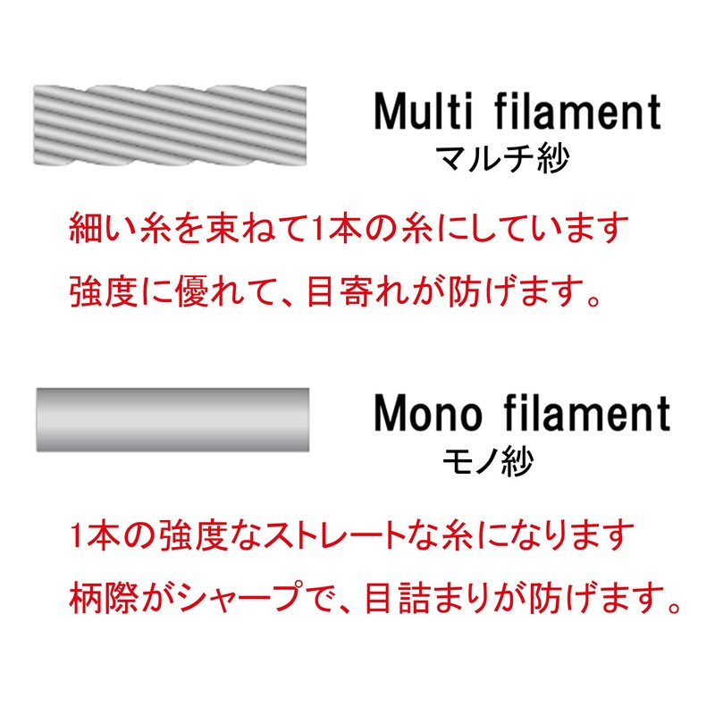 - UMO (heat sealed monoscillation): The outer part of the mono thread is heat-sealed polyester processed, so it does not shift at the intersection of the thread, so the opening is uniform, making it suitable for high precision printing