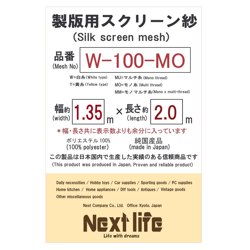 [nextlife] W-100-MO Screen Cloth for Plate Making (Silk Screen Mesh), Domestic Product, 100% Tetoron, Screen Printing, Width 5.3 ft (1.35 m) x Length 6.6 ft (2.0 m) (White) (24-315 Mesh Various Available)